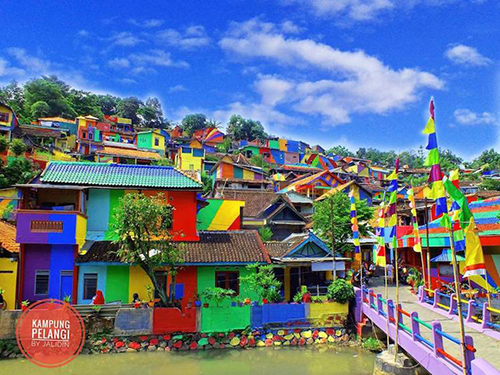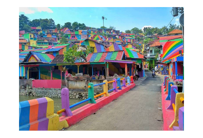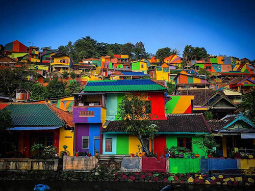 為了改變當地的老舊景色,印尼小鎮將超過 200 棟房屋,塗上鮮豔的各種色彩,為小鎮充滿全新能量。這座小鎮的名字,原先叫作 Kampung Wonosari,為了更符合它的新外觀,它得到一個美麗的名字──Kampung Pelangi,翻譯成中文就是「彩虹村」。