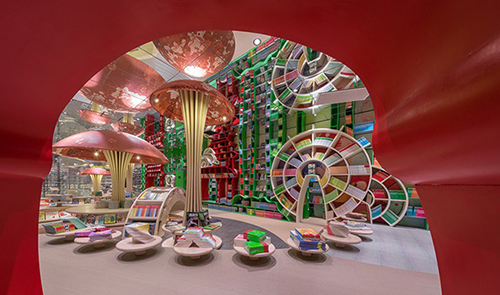 鍾書閣位於銀泰中心的四樓,穿越書店走到右側,可以看見處處縈繞著竹香的兒童區,在這裡,書架的形式變得十分活潑,有竹林、有房子、有風車、有愛玩耍的熊貓,還有巨型蘑菇作為孩童的閱讀區,以及鍾書閣最經典的鏡面天花板。孩子們在這邊沒有沉重的閱讀壓力,而能以最輕鬆的方式,進入書中的世界。