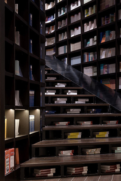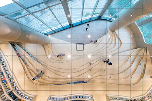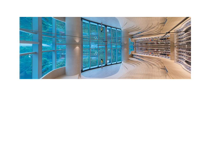 在書店的盡頭則是講堂,講堂內,行雲流水般的線條像等高線一樣,化成高度不一的階梯,從鏡面天花板的倒影來看,這些階梯看起來更像是梯田,只不過種的是精神食糧,讀者可以透過激勵人心的講座或是發人深省的戲劇,來充實自己的心靈。