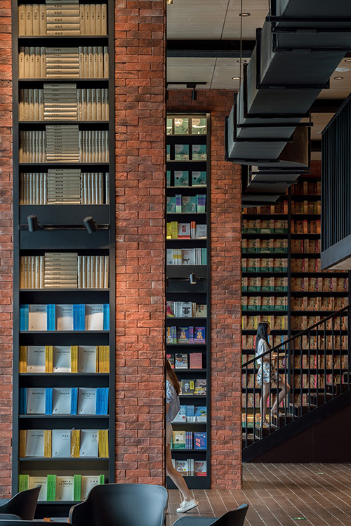 而在書店的左側,五公尺高的挑高空間中,被分割成兩層樓,紅色的磚牆直通到頂,圍成一個個獨立的閱讀空間,打造出成熟的大人閱讀世界。在這裡,閱讀就像在圖書館裡一樣的安靜又隨性,讀者可以沿著走道在堆滿書的磚牆,挑選自己想要看的書,然後找個光線好的位置坐下來,就能開始閱讀,不用擔心受旁人打擾。