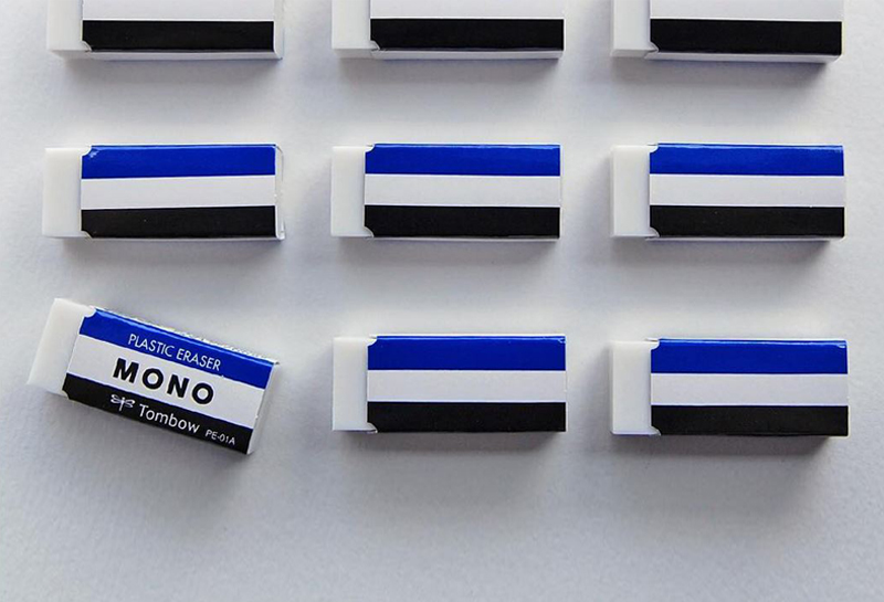通常一提到蜻蜓牌橡皮擦,第一個想到的一定是藍、白、黑條紋的外包裝上,印著大大的MONO四個字母,一旁還有Tombow和蜻蜓符號的正字標記,以及塑膠橡皮擦的英文字樣,過去雖然經過幾次「改版」,大致仍保有這幾個元素。