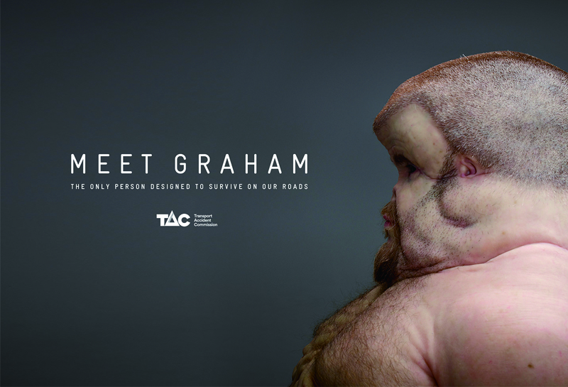 如果無法改裝車體,那就改造人體吧!澳洲維多利亞州的交通事故委員會,委託了雕塑家、創傷外科醫生、汽車碰撞調查員,共同創造了「葛拉漢」(Graham)這個人物。葛拉漢的身體構造完全是為了抵禦車禍傷害而生,因此他有著大型安全帽似的頭骨、安全氣囊般的肋骨、粗到不能稱之為脖子的頸部、堅韌不怕燒燙的肌膚等,讓他得以在嚴重的車禍中倖存。