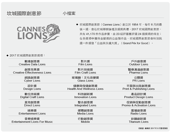 (2017年9月497期動腦雜誌)《動腦》編輯部精選第64屆坎城國際創意節當中,5部奪得全場最大獎的精彩作品,並透過紅坊創意的創意總監吳靖信點評,一窺創意改變世界的巨大能量。