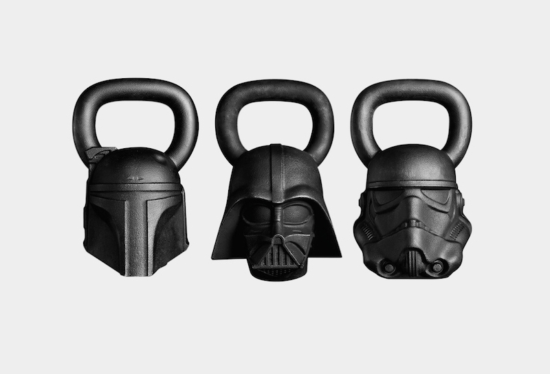 壺鈴方面,重量可以根據個人需求,調整為 50 磅(22.7 公斤)、60 磅(27.2 公斤)或是 70 磅(31.75 公斤),造型也依重量而有所不同,分別為 Boba Fett、帝國風暴兵和黑武士,練完之後應該會和他們一樣雄壯威武。