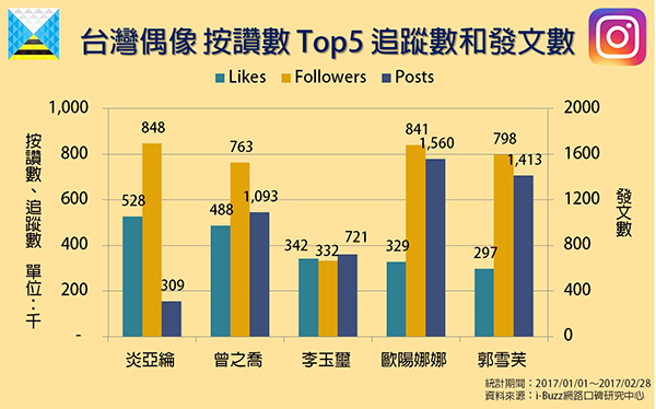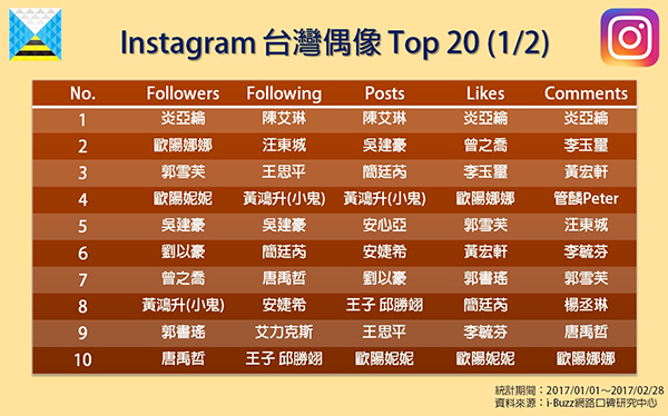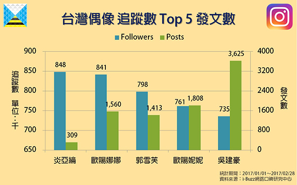 (2017-09-27)在眾多台灣偶像中,追蹤數以炎亞倫、歐陽姐妹、郭雪芙和吳建豪名列前五名,他們都以70萬以上的粉絲數領先眾人。