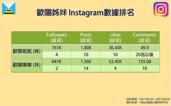和炎亞倫不同,更Young的歐陽姐妹都只經營IG,因為彼此貼文的豐富性間有明顯差異,娜娜在各項數據上表現都比妮妮來得好,追蹤數和按讚數分別有兩個和六個名次之差,在留言數對比更明顯,數量上相差兩倍,名次差了超過十名。