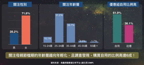 關注母親節的族群輪廓中,以女性居多(71.8%);主要關注年齡層落在25-34歲區間(51.2%),其次為35-44歲(33.7%);而商品優惠組購買後,消費者「自用」比例較高(61.9%)。