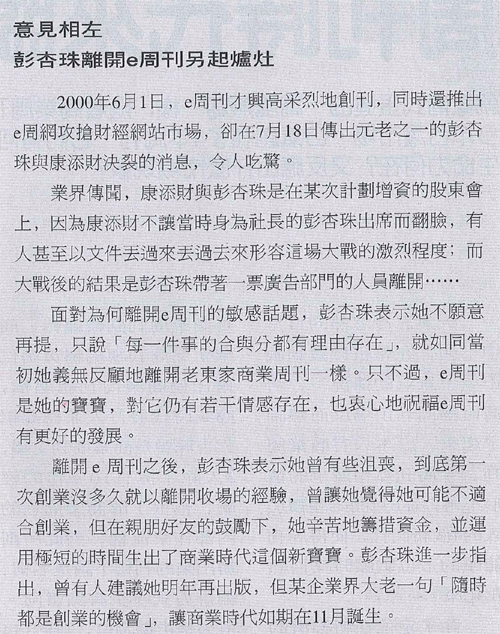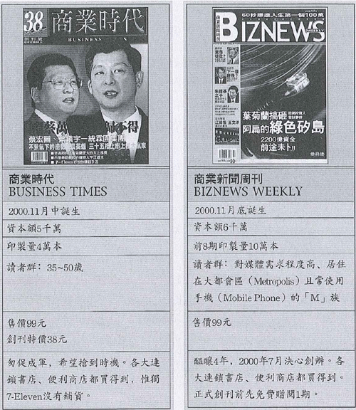 說起這2本新雜誌還真有些相目似之處,如果把商業周刊、e周刊拿來一起做比較的話,之間的關係更是微妙!先從經營者談起,e周刊發行人康添財曾是商業周刊總編輯,商業新聞周刊總編緝黃鴻仁擔任過商業周刊總編輯,商業時代發行人兼總編緝彭杏珠曾是商業周刊主編,3人除了擁有10多年的經驗,也很了角解商業周刊的內部作業流程,因此所創辦出來的刊物不論是名稱、編排方式多少有點雷同。再來是市場定位,雖然這4本雜誌的內容屬性仍有所區隔,但都被歸類為財經類周刊,最後到底鹿死誰手,有待觀察。