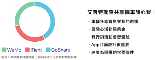 而最晚上線卻聲量最高的GoShare以體驗行銷與知名度打通市場,更串起換電站景點收服車友;相較iRent以涵蓋區域廣及App功能更顯特色,新型車款在試乘上滿足車友的好奇心;其次則為經營許久的WeMo,以人工換電及日租無限騎方案成鄉民選擇,親民客服也獲得大票讚賞。