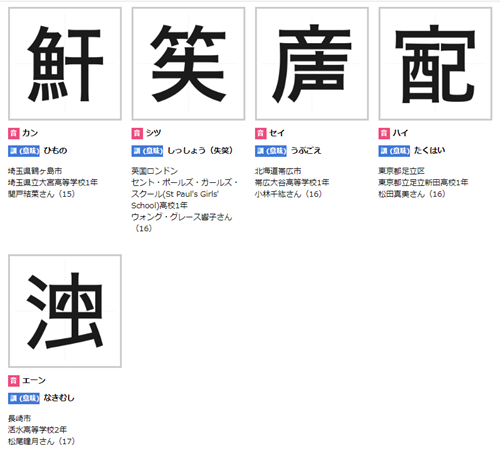 関戸結菜さん所創作的カン,簡簡單單的魚和干,合起來就是海鮮乾貨;星野義仁さん將四葉草簡化成草字頭加上四;三浦まもるさん把無障礙設施直接具象化,直接把樓梯蓋在無字的上頭;另一個具象化的例子,則是中和哉さん所創作的シュ,字如其形,舉起雙手喊著萬歲。