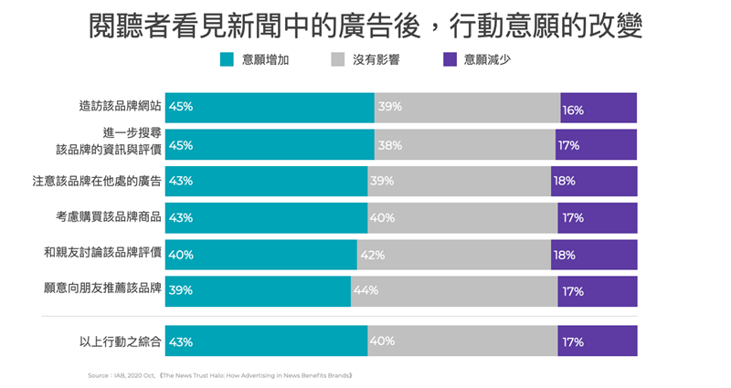 IAB表示,對嚴重、突發消息(如疫情)新聞感興趣的受眾,遠多於對其他內容感興趣的受眾;研究也顯示,消費者更容易信任在新聞媒體中所看到的廣告品牌,甚至有更多的意願進行購買。