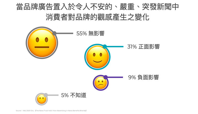 然而⋯⋯數字會說話!調查顯示,當閱聽者閱讀嚴重、突發或令人沮喪的新聞時,僅有9%讀者會對新聞內的廣告產生負面的觀感;相反地,卻有31%讀者對該品牌產生正面的印象、55%讀者持中立態度。