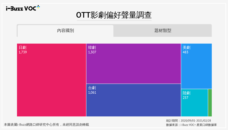 日劇作為台人最喜歡的類型,但Netflix上大約只有三成是日劇、動漫,KKTV擁有近八成,日劇內容較完整豐富,有網友推薦「愛看日劇用kktv」,未來可以發展成日劇主打平台。另外,Line TV以韓劇為主,各影劇題材佔比平均,可滿足哈韓族對不同的題材影視需求。