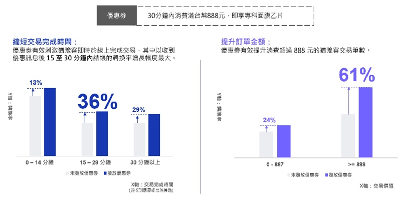 限時30分鐘的消費滿額贈成功加速猶豫客跨越消費門檻,15分鐘內結帳者增加13%,15-30分鐘內結帳者增加36%,訂單滿額者增加61%。