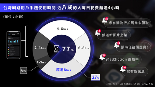 根據調查,有 77% 的台灣網路用戶每天花費超過 4 小時在使用手機,其中超過8小時的更有 27%,僅有 6% 用戶使用時間少於兩小時。在食衣住行育樂皆仰賴手機搞定的時代,使用者在不同平台、網站之間非線性的頻繁轉換已成常態,也意味使用者的時間和注意力被切得更加零碎,不論在社群媒體、影音串流、手遊程式到網購平台,皆是時間與注意力相互競奪的戰場。