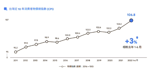2022 年,對台灣而言是內外夾攻的一年:外有烏俄軍事衝突,引發糧食和能源危機;內則迎來本土疫情升溫,面臨「與病毒共存」必經的陣痛期,種種因素使得物價直漲。報告指出,2022 上半年,台灣消費者物價總指數(CPI)來到 106.8,相較去年同期成長 3%,創近 10 年新高。然而,若將台灣的通膨率,放在國際的尺度中檢視,可見相較於其他成熟經濟體,預估數值相對和緩、穩定,可知通膨情形短期內不至於打擊國民消費力,只是消費者將考慮通膨因素,更加精打細算、精心分配購物預算。
