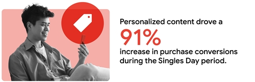 2021 年雙 11 期間,個性化廣告驅動了 91% 轉換成長。建議品牌善用官網、應用程式或實體店鋪的第一方數據,針對個別消費者提供相應的行銷內容。