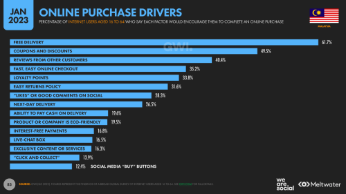 據報告統計,馬來西亞消費者的前五大網購動機,分別為免運優惠、折扣禮券、客戶評價、流暢的結帳過程,以及會員點數累積消費金,大多數誘因都是出自便宜、划算的消費,顯然促銷活動是最有效的行銷策略。