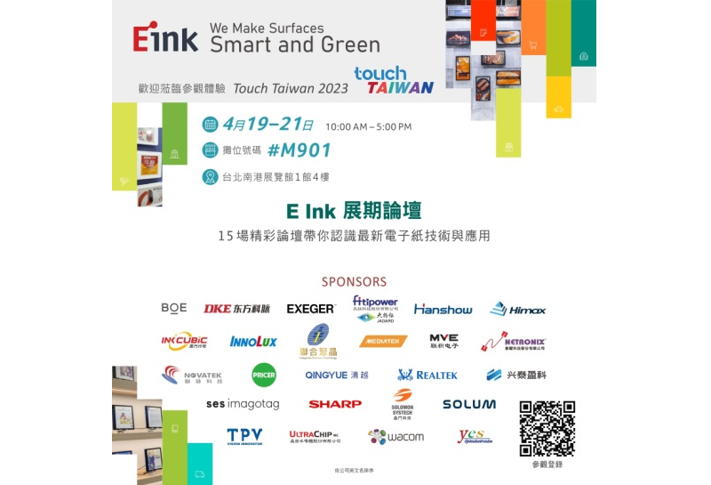 (2023-04-17)以打造低碳電子紙為技術核心,結合電子紙生態圈夥伴的創新技術及產品設計,完整展出電子紙上中下游生態圈技術、系統與多元應用的低碳永續電子紙解決方案。