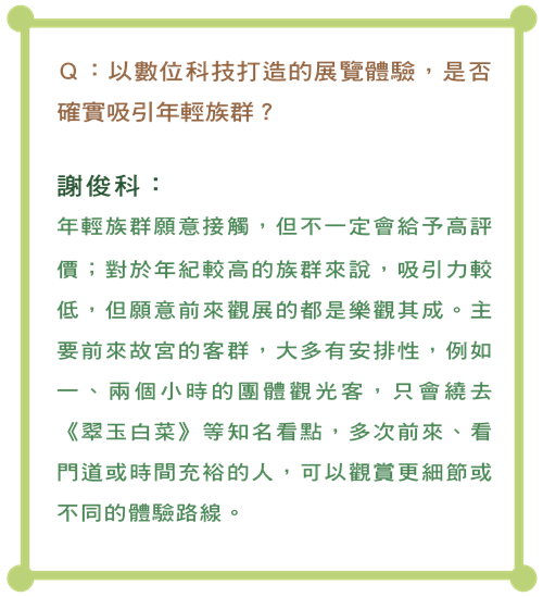 目前故宮在數位內容的創意上,若與內部單位合作,會鼓勵保留更多文物真實性;若是外部的工作團隊,則會給予更多天馬行空的空間。謝俊科解釋,「磨合」可能反而磨掉新的想法。有時合作方會將文物做的非常新潮或可愛,但不具備原先的藝術感受;或者即使搬到數位世界,還能還原其藝術感。從「忠於文物」到「新創手法」,不同合作目標,都有不同的創意手法。