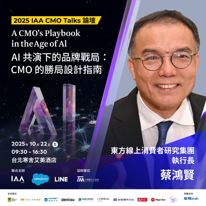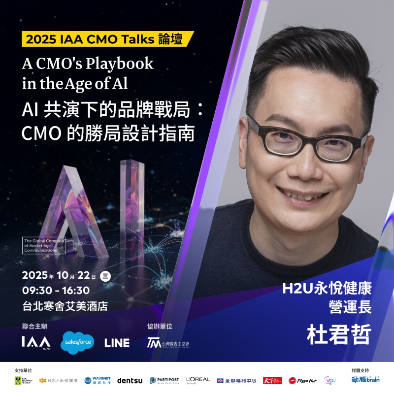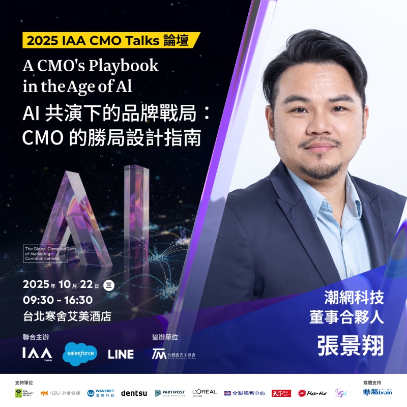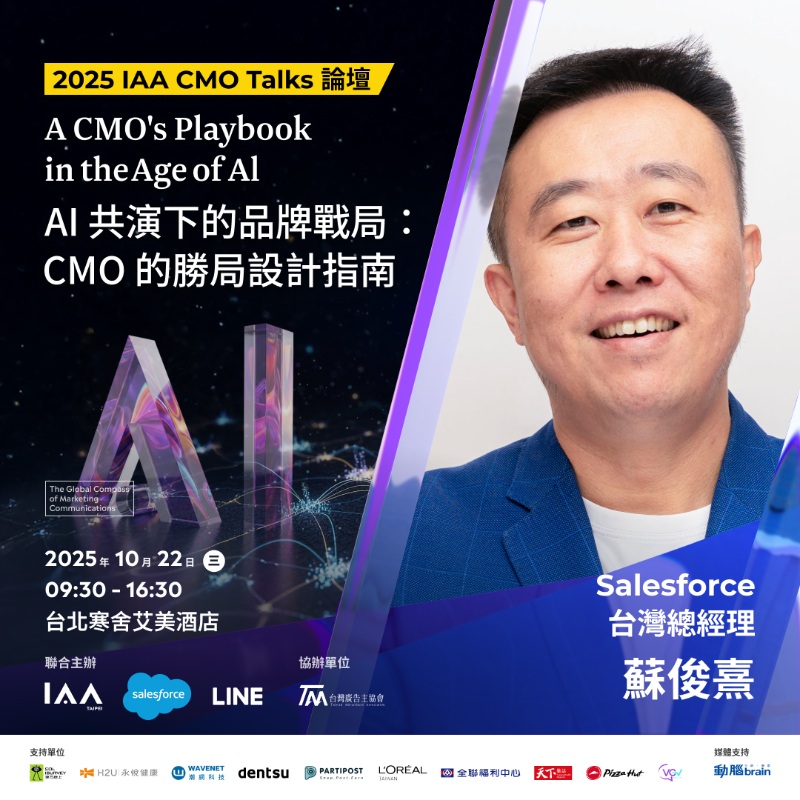 將於10/22 (三)假台北寒舍艾美酒店登場,以「AI共演下的品牌戰局:CMO的勝局設計指南」為主題,IAA攜手Salesforce以及LINE聯合主辦、TAA台灣廣告主協會協辦,並廣邀零售、美妝、汽車、出版、健康與行銷科技領域的國內外資深CMO專家同場交流,一日濃縮全球趨勢 × 在地實戰;並於論壇當日首度發表「2025 CMO大調查白皮書」,歡迎報名與會。