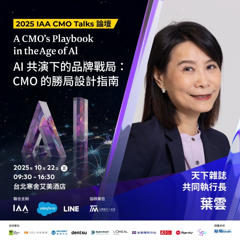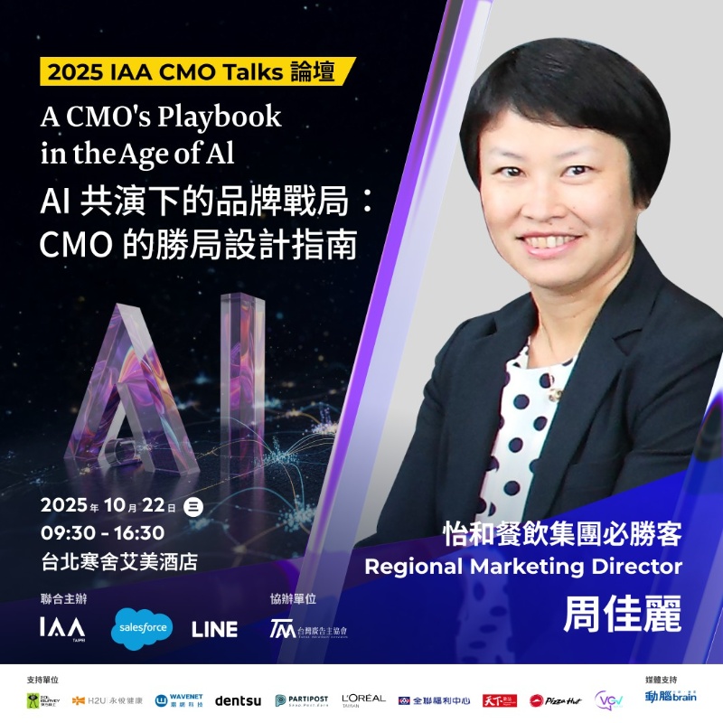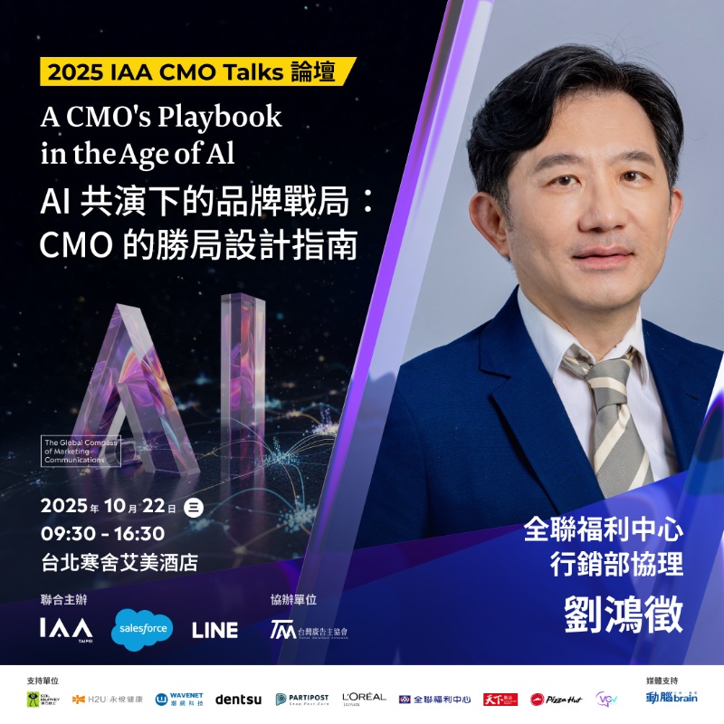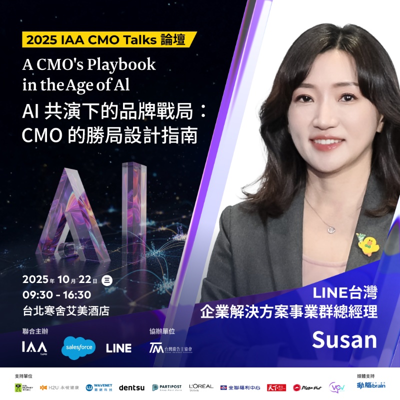 將於10/22 (三)假台北寒舍艾美酒店登場,以「AI共演下的品牌戰局:CMO的勝局設計指南」為主題,IAA 攜手Salesforce以及LINE聯合主辦、TAA台灣廣告主協會協辦,並廣邀零售、美妝、汽車、出版、健康與行銷科技領域的國內外資深CMO專家同場交流,一日濃縮全球趨勢 × 在地實戰;並於論壇當日首度發表「2025 CMO大調查白皮書」,歡迎報名與會。