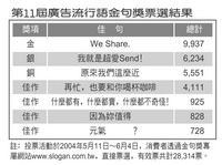 在成千上萬廣告流行語中﹐哪一句消費者最喜歡﹖第11屆廣告流行語金句獎選拔活動﹐在2004年5月11日~6月4日﹐有近3萬消費者上網投票﹐http://www.slogan.com.tw。最後分別由「We Share.」﹑「我就是超愛Send﹗」﹑「原來我們這麼近」獲得金﹑銀﹑銅獎。
