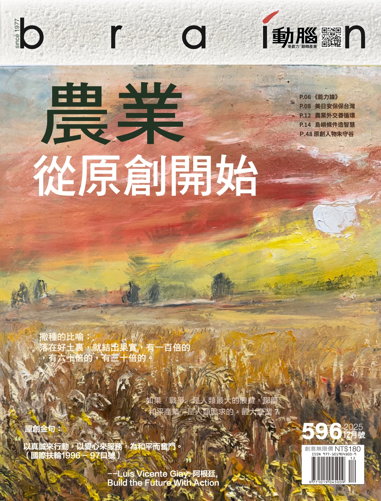 本期《動腦雜誌》596期2025年12月號,以「農業-從原創開始」為題。台灣農業的焦點或許應從「糧食是否足夠」轉向「是否具備持續創造農業安全與價值的原創能力」。農業安全與價值的原創能力」。