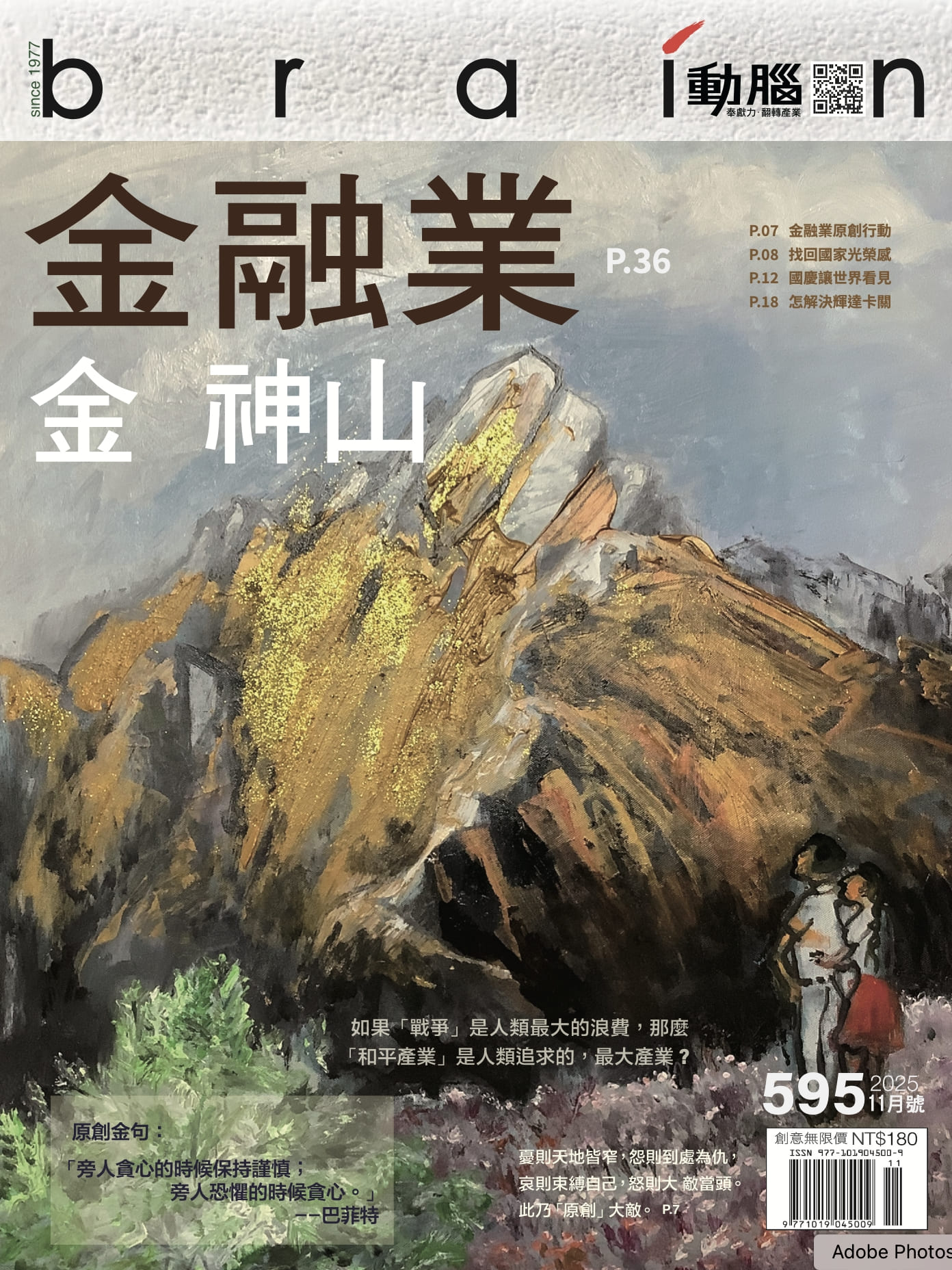 本期《動腦雜誌》595期2025年11月號,以「金融業-金神山」為題。金融業在台灣充滿了機會與挑戰。機會:可否善用工具更優化服務,如AI。挑戰之一:使詐騙集團、地下錢莊消彌於無形!金融業固涉及通澎通縮,利率滙率等除外,關於民生經濟消費,以銀行業來說如借貸,雨天收傘,對那些陷入困境的企業和家庭,無疑是雪上加霜,能致他們於死地。