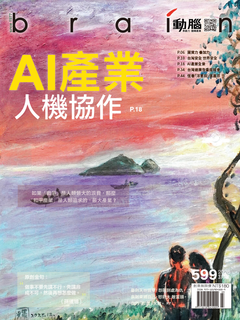 《動腦》第599期以「AI產業:人機協作」為封面故事,探討AI從「造夢期」邁入「落地應用」的關鍵變革。本期深入剖析2026年AI產業全景,涵蓋代理型AI(Agentic AI)如何重塑顧客旅程、企業導入實戰指南及風險治理。透過專家觀點,解構從智慧金融到行銷流程的自動化轉型,並探討「人機協作」模式下,行銷人如何從軟體操作者轉變為AI指揮官,在矽基與碳基共存的時代,將算力轉化為驅動企業長期成長的關鍵動能,打造更有溫度的未來生活。